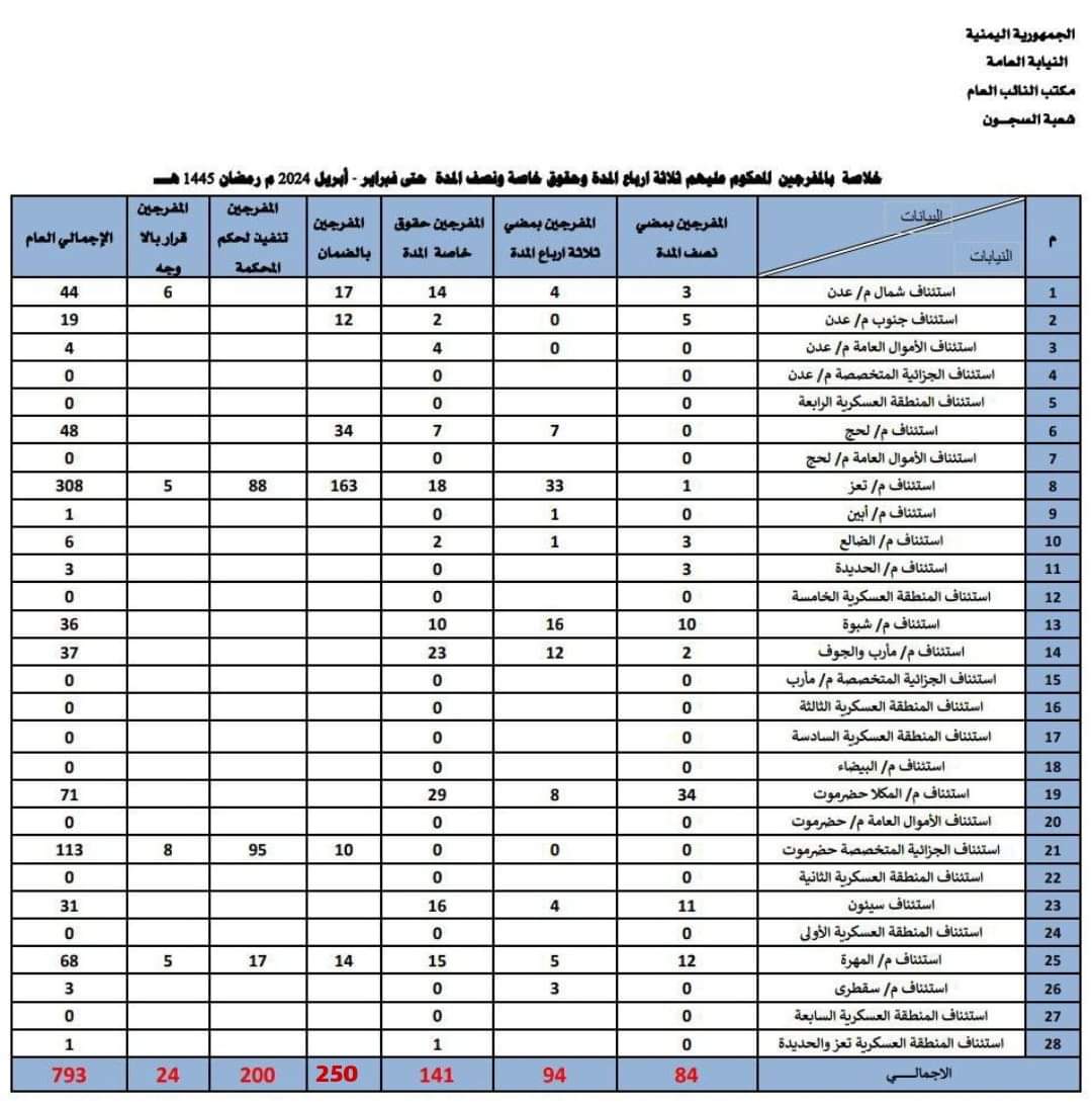وقد قامت شعبة السجون في مكتب النائب ممثله برئيسها الدكتور ناصر الصبيحي وطاقم الشعبة بالنزول والمتابعة لكافة النيابات في المحافظات المحررة وزيارة الاصلاحيات المركزيه للوقوف على تنفيذ التعميم المشار إليه أعلاه، وبمتابعة مستمره من قبل معالي النائب العام والمحامي العام الأول، كُلل خلاصة ذلك الجهد في الإفراج على عدد 793 من المحكومين، حيث شمل الإفراج على 84 مفرج بمضي نصف المدة، و 94 مفرج بمضي ثلاثة أرباع المدة، و 141 مفرج حقوق خاصة، 250 مفرج بالضمان، 200 مفرج تنفيد لحكم المحكمة، 24 مفرج قرار بالا وجه وذلك وفقاً للكشف الصادر من شعبة السجون الخاص بالمفرجين حتى يومنا هذا الثلاثاء تاريخ 4/9/ 2024م الموافق ٣٠ رمضان ١٤٤٥هـ.