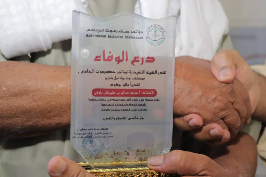 كرّمت الهيئة التنفيذية لمكتب مؤتمر حضرموت الجامع في مديرية غيل باوزير اليوم الجمعة عددًا من الشخصيات التربوية و النقابية والاجتماعية في مدينة غيل باوزير، حيث تم تكريم الأستاذين التربويين محمد حسين البكري واحمد سالم بن شيخان باوزير والأستاذ النقابي سالم عمر بن غوث باوزير بدروع الوفاء تقديرًا لما قدموه من عطاء وجهود مشرّفة خلال عملهم وخدمة المديرية من مواقعهم القيادية .