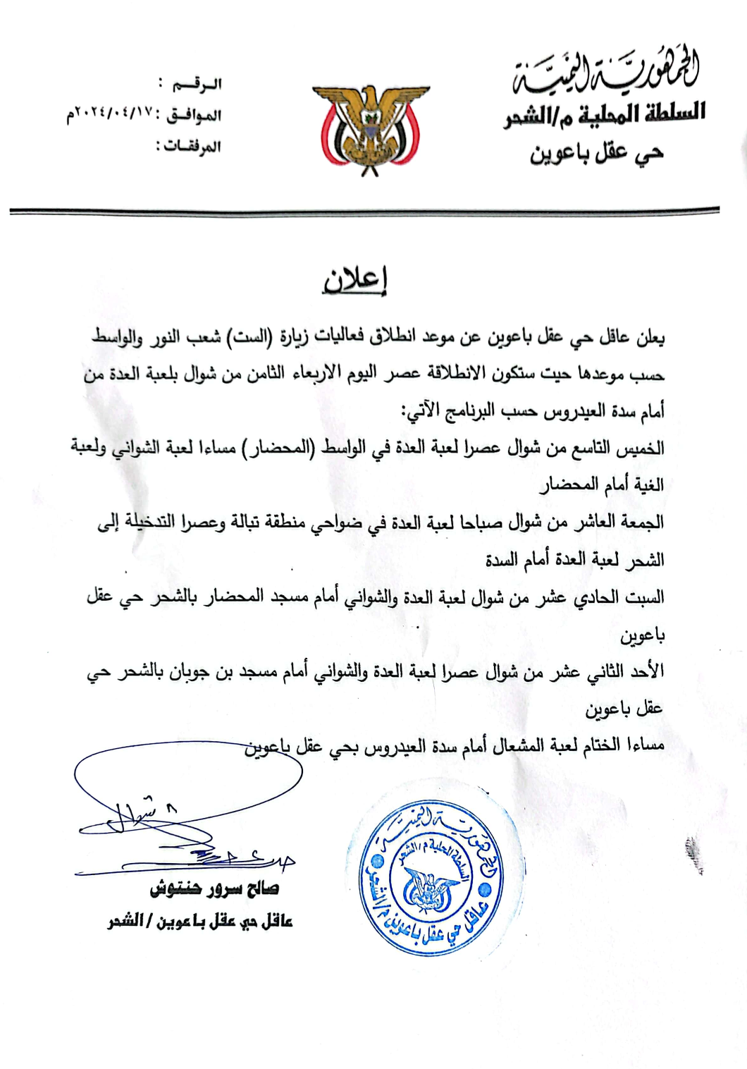 تحصل موقع قناة عاد على إعلان رسمي من عاقل حي عقل باعوين بمديرية الشحر يؤكد موعد انطلاق فعاليات زيارة (الست) شعب النور والواسط حسب موعدها حيث ستكون الانطلاقة عصر اليوم الاربعاء الثامن من شوال بلعبة العدة من أمام سدة العيدروس حسب البرنامج التالي: