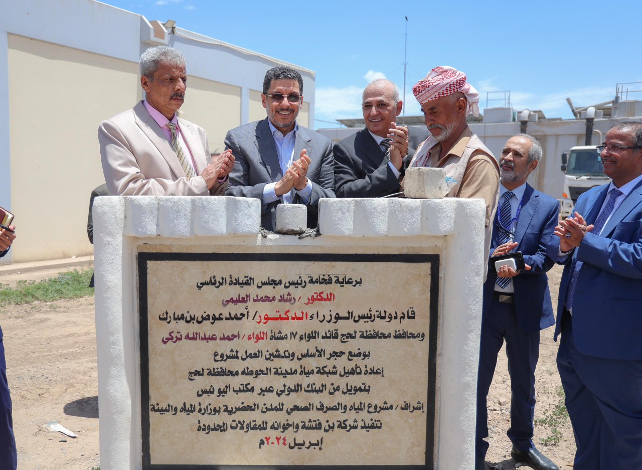 كما وضع دولة رئيس الوزراء الدكتور أحمد عوض بن مبارك، حجر الأساس وتدشين العمل لمشروع إعادة تأهيل شبكة مياه مدينة الحوطة محافظة لحج، والبالغ تكلفته مليون وسبعمائة الف دولار.