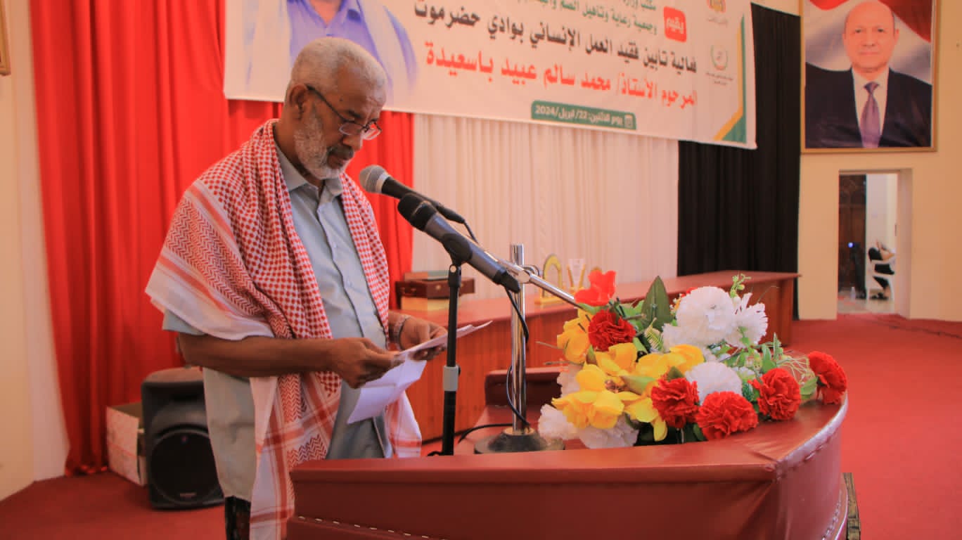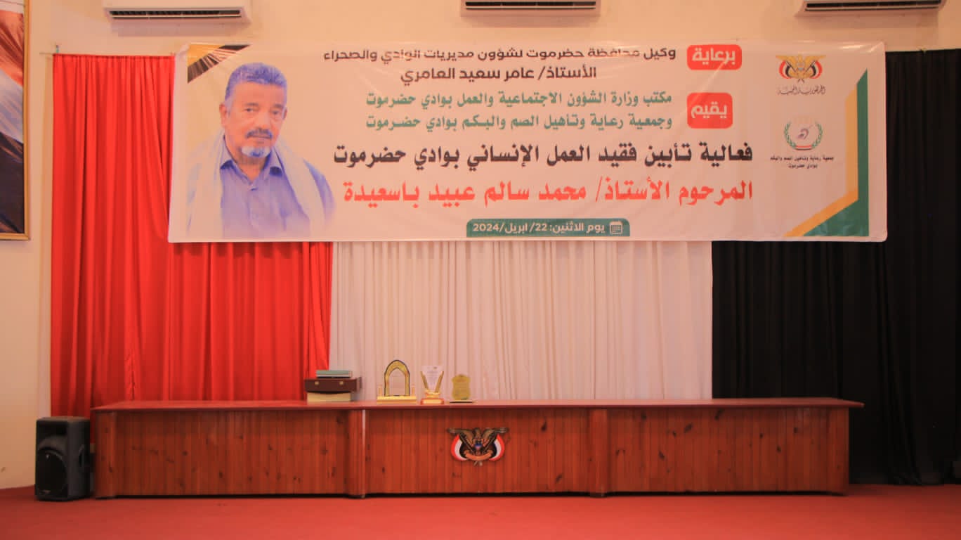 بحضور وكيل محافظة حضرموت لشؤون مديريات الوادي والصحراء، الاستاذ عامر سعيد العامري، نظم مكتب وزارة الشؤون الاجتماعية والعمل بوادي وصحراء حضرموت، وجمعية رعاية وتأهيل الصم والبكم بوادي وصحراء حضرموت فعالية تأبينية لفقيد العمل الانساني الاستاذ محمد سالم باسعيده.