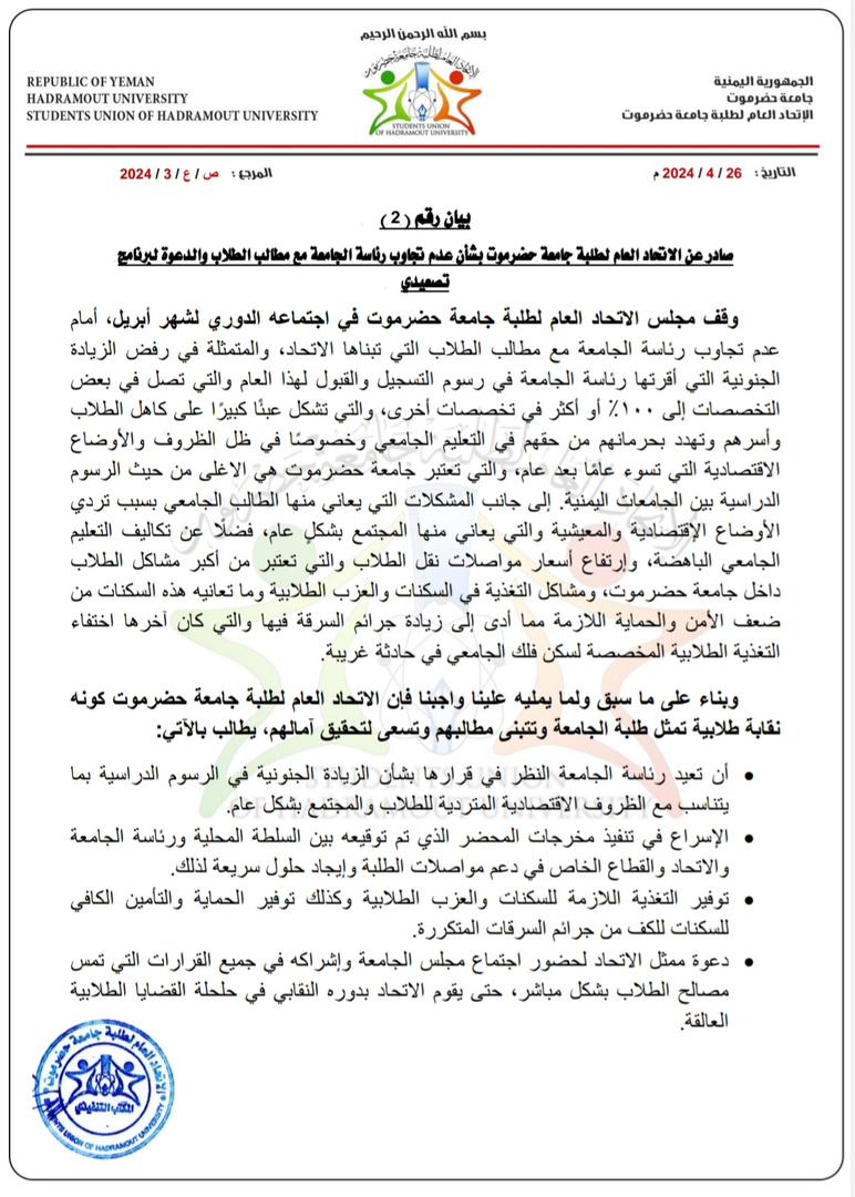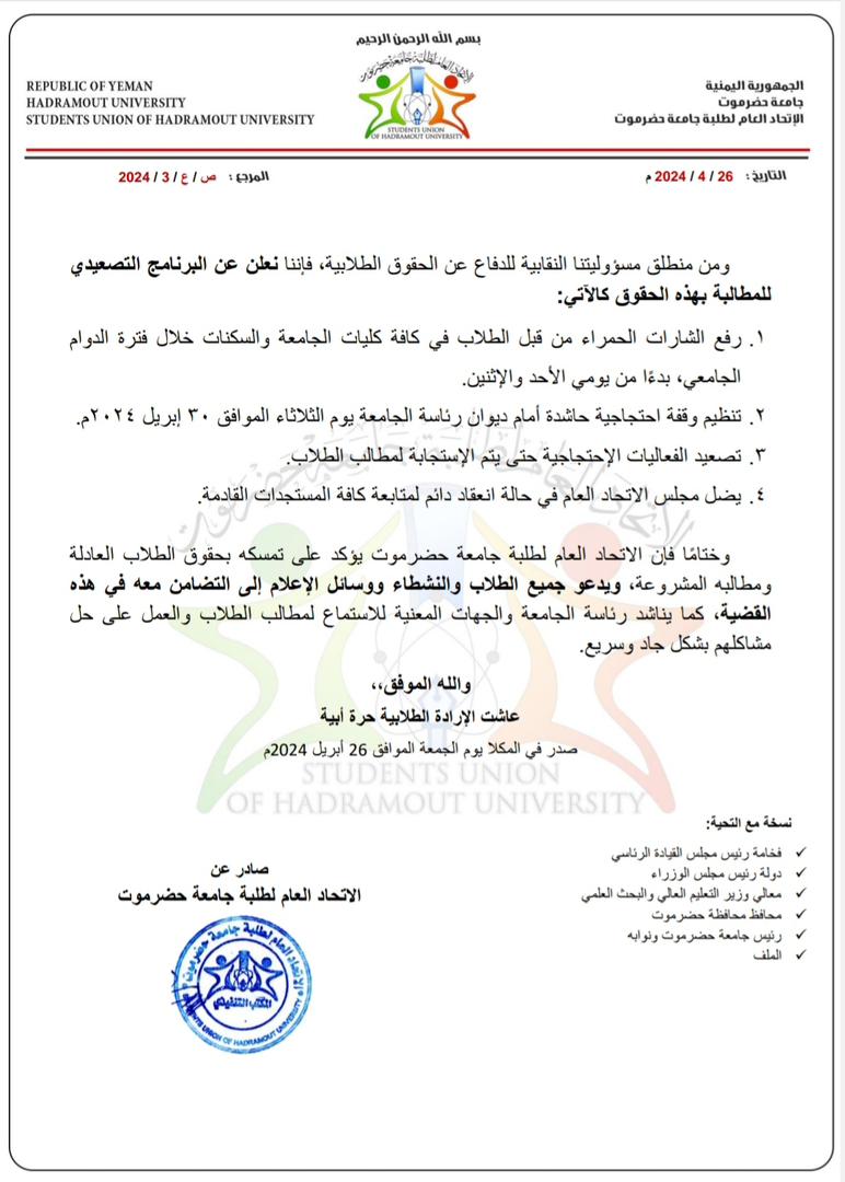 *وبناء على ما سبق ولما يمليه علينا واجبنا فإن الاتحاد العام لطلبة جامعة حضرموت كونه نقابة طلابية تمثل طلبة الجامعة وتتبنى مطالبهم وتسعى لتحقيق آمالهم، يطالب بالآتي:*