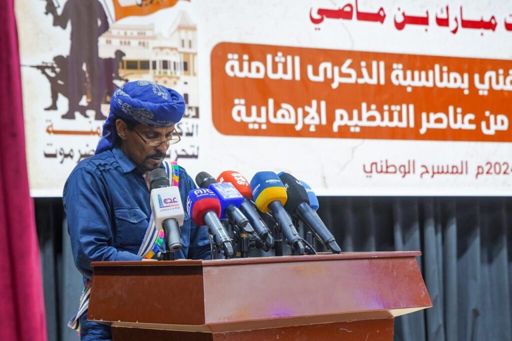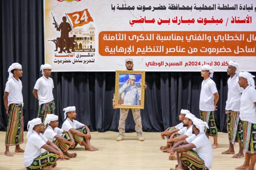 كما تخللت فقرات الحفل، لوحة فنية حملت عنوان “ملحمة جذور الانتماء النخبة والشعب”، جسّدت قصة الصمود والتضحية، والتلاحم الوطني لقوات النخبة الحضرمية التي أسهمت في تحقيق النصر الكبير على تنظيم القاعدة الإرهابي، وإعادة الحياة إلى المحافظة، بعد أن عانت لمدة عام كامل من سلب للحريات والحقوق والتنكيل بالشباب والمرأة وفرض القيود على المجتمع.