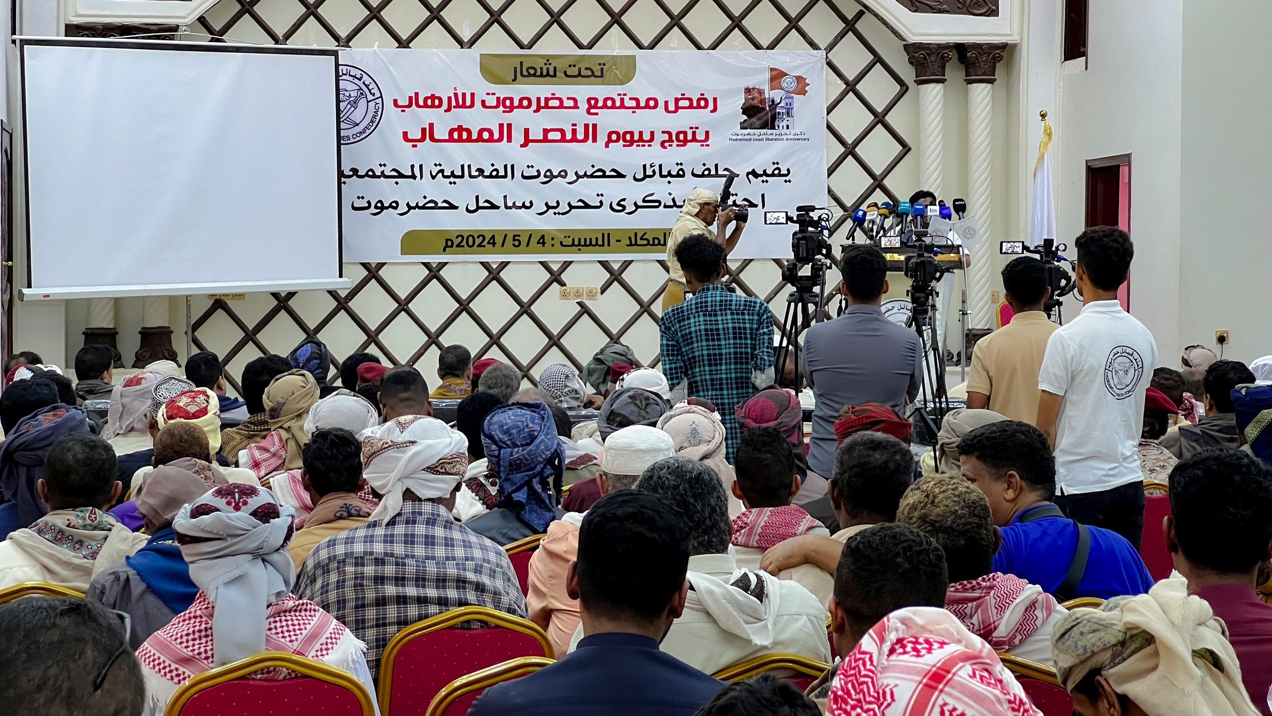 وفي الفعالية التي أقيمت تحت شعار «رفض مجتمع حضرموت للإرهاب يتوج بيوم النصر المهاب»، ألقى رئيس حلف قبائل حضرموت ورئيس مؤتمر حضرموت الجامع الشيخ عمرو بن حبريش العليي كلمة ترحم في مستهلها على أرواح شهداء مواجهة عصابات القاعدة والتخلص من العناصر الإرهابية في كل أرجاء حضرموت عسكريين وامنيين وقبائل و مدنيين مشيرًا إلى أن الإنتصار الذي تحقق على قوى الإرهاب جاء بفضل من الله سبحانه وتعالى و بجهود المجتمع الحضرمي بكل أطيافه الذي هو الأساس، مؤكدًا بأن حلف قبائل حضرموت قد أسس للنضال واجتثاث المظالم والممارسات القمعية على أبناء حضرموت ومنها القتل لكوادرها العسكرية والأمنية والإقصاء والتهميش والنهب للمقدرات، وخاض مرحلة طويلة وعمل ميداني وسياسي، وقدم الكثير من التضحيات لمواجهة هذه المظالم وإزالتها ومنها استشهاد مؤسس الحلف.