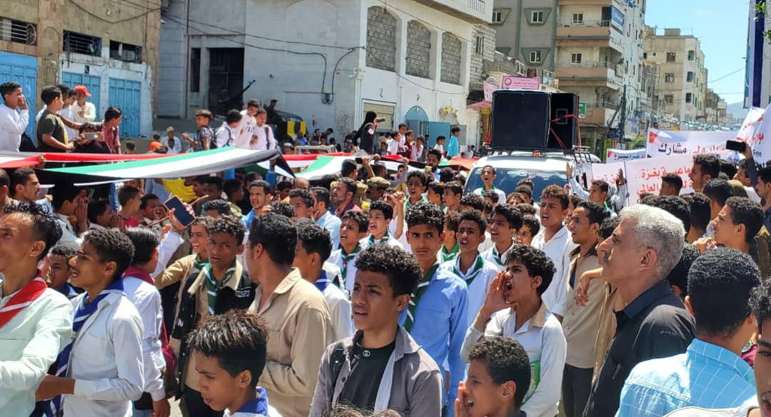 وقال المشاركون في المسيرة ” أننا نعيش في تعز ونتجرع المعاناة المتمثلة بالحصار والقتل المستمر من قبل مليشيا الحوثي الارهابية التي ما زالت ترتكب الجرائم العدوانية بحق أبناء تعز منذ تسع سنوات، وندعو العالم الى إيقاف هذه المأساة الانسانية في تعز وغزة”.