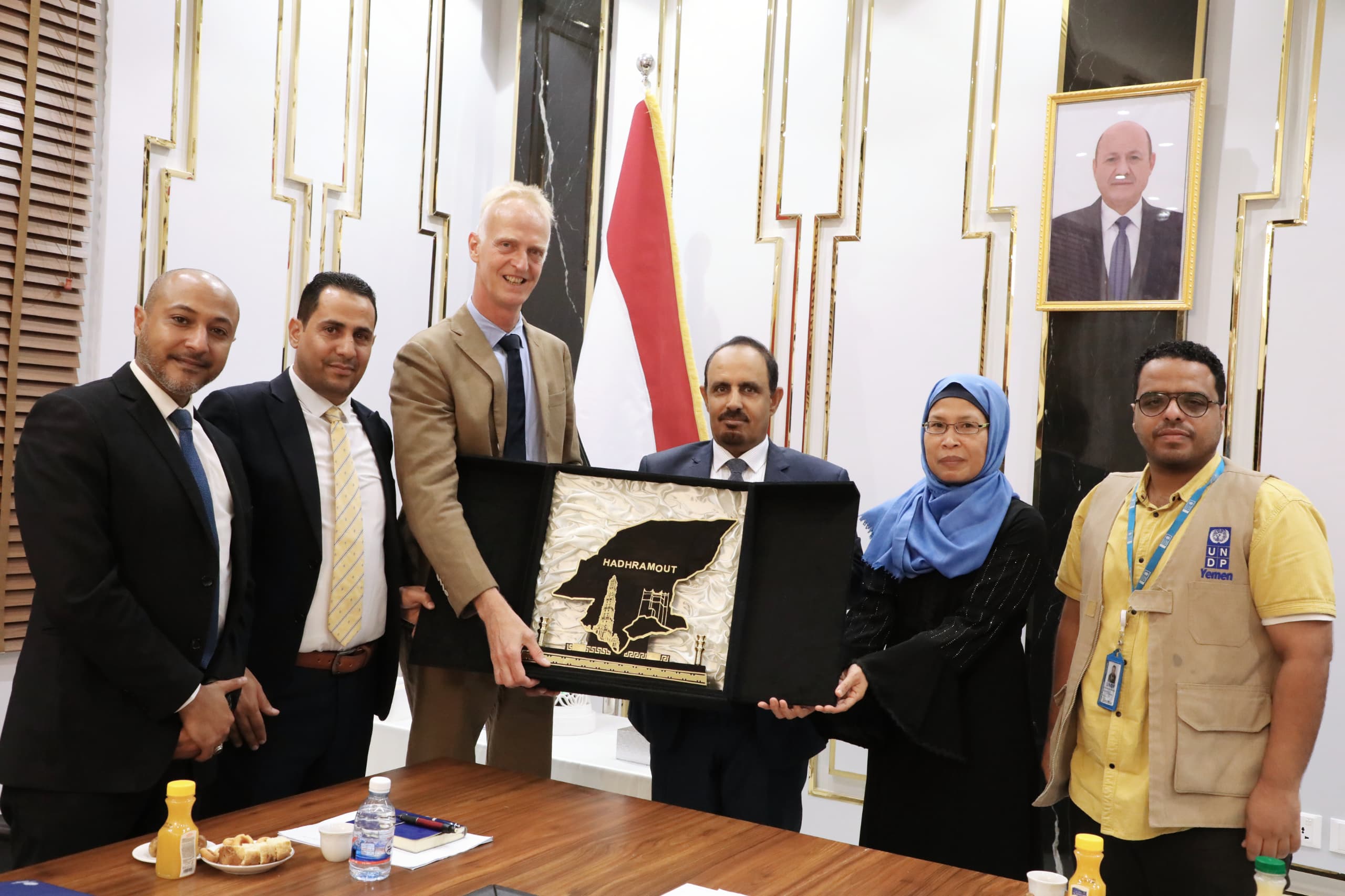 بحث محافظ حضرموت الأستاذ مبخوت مبارك بن ماضي، اليوم بالمكلا مع وفد برنامج الأمم المتحدة الانمائي UNDP برئاسة السيد بيتر فاندر فول، تدخلات مشروع دعم المرونة المؤسسية والاقتصادية في اليمن ومشاريعه المنفذة في تعزيز البيئة الاقتصادية والمجتمعات المحلية بالمحافظة.