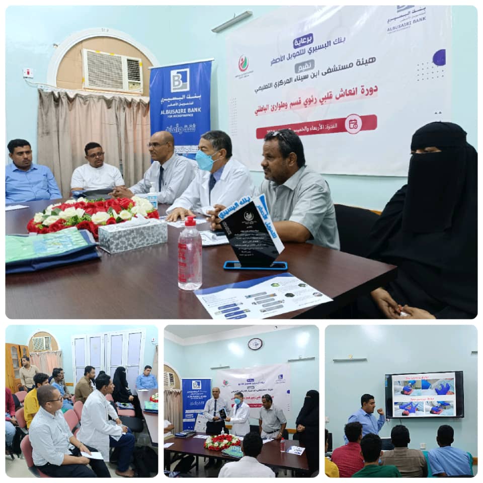 دشن رئيس هيئة مستشفى إبن سينا الدكتور حسين زين الحداد صباح اليوم دورة الانعاش القلبي الرئوي لأطباء قسم وطوارئ الباطنه بقاعة الفقيد الدكتور المرحوم أبوبكر الزبيدي للمناقشات العلمية لقسم الأمراض الباطنة بالهيئة ، بحضور نائب رئيس الهيئة للشؤون الإدارية الأستاذ عوض باحنحن.