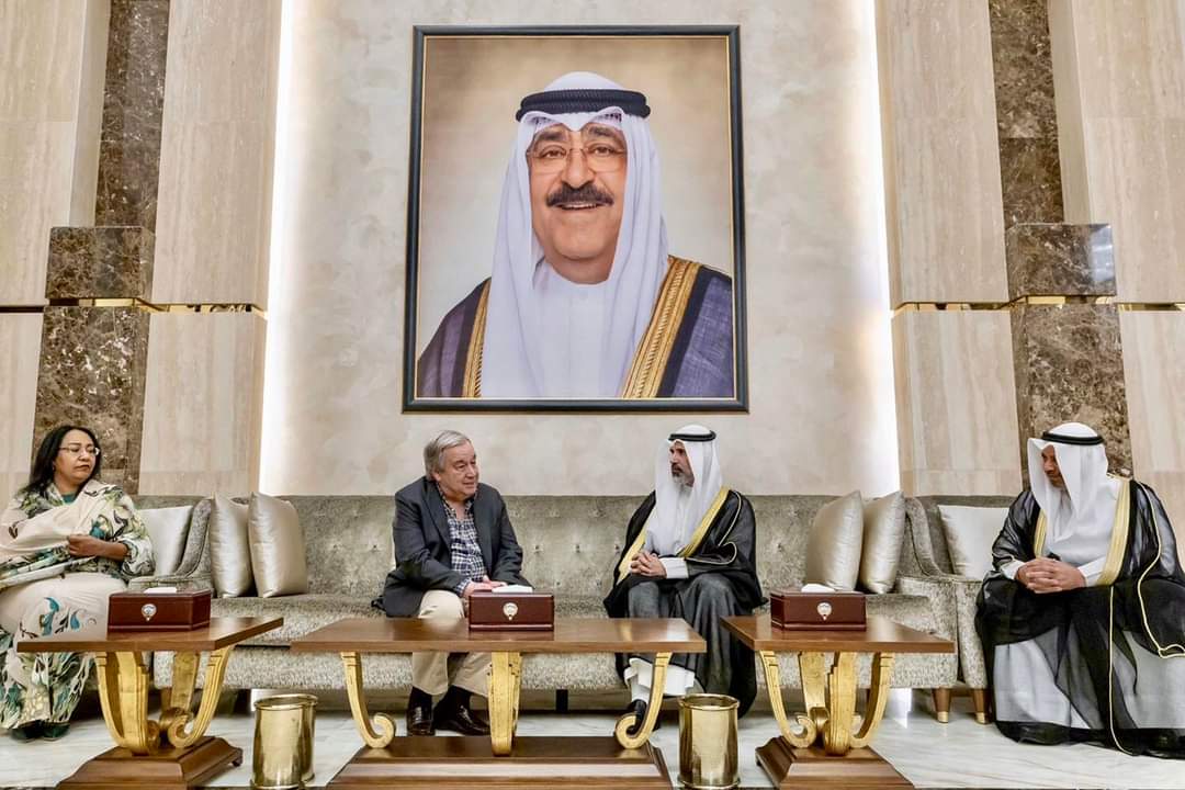 بحث امير دولة الكويت صاحب السمو الشيخ مشعل الأحمد الجابر الصباح، مع الأمين العام للأمم المتحدة انطونيو غوتيريش، والوفد المرافق وذلك بمناسبة زيارته للبلاد، مساعي دعم السلم والامن الدوليين، وتنسيق الجهود الهادفة للتنمية والمبادرات الانسانية.
