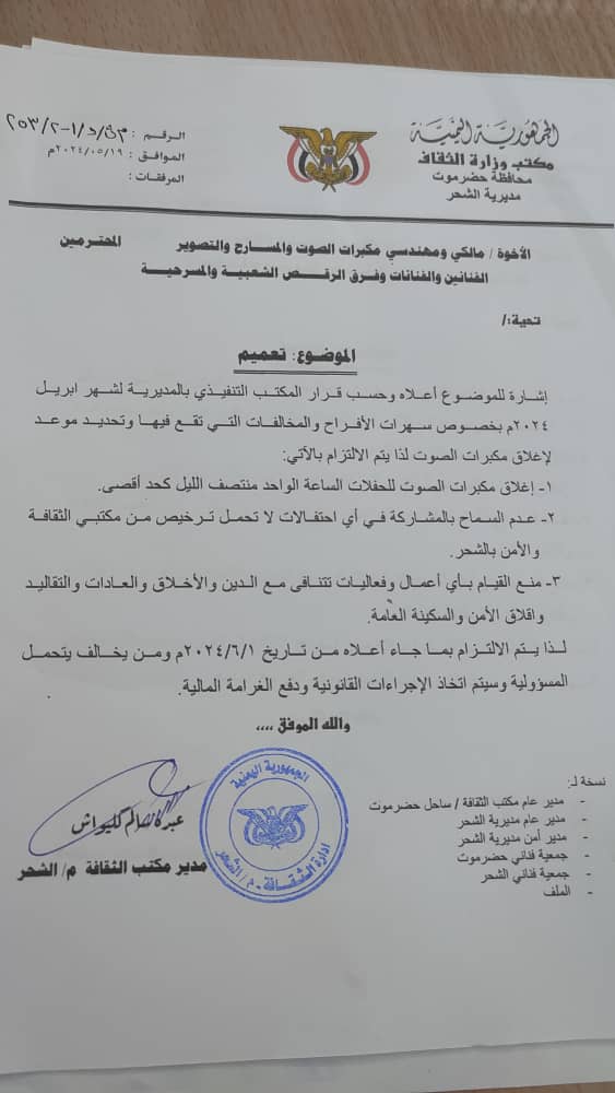 بناءا على قرار المكتب التنفيذي بمديرية الشحر، وجه مكتب الثقافة بمديرية الشحر رسائل خطية إلى مالكي ومهندسي مكبرات الصوت والمسارح والتصوير والفنانين والفنانات وفرق الرقص الشعبية والمسرحية، بخصوص السهرات والحفلات الرجالية والنسائية والمخالفات التي تقع فيها.