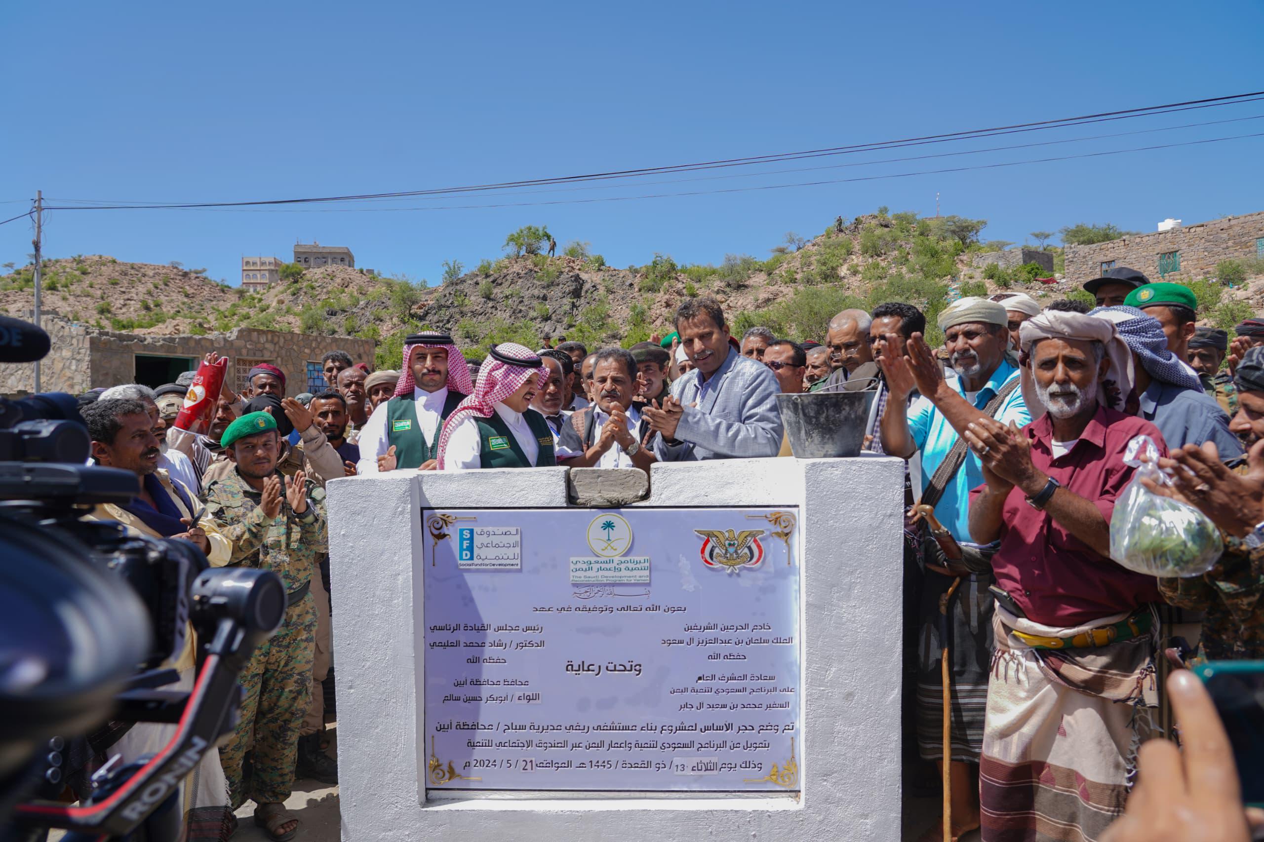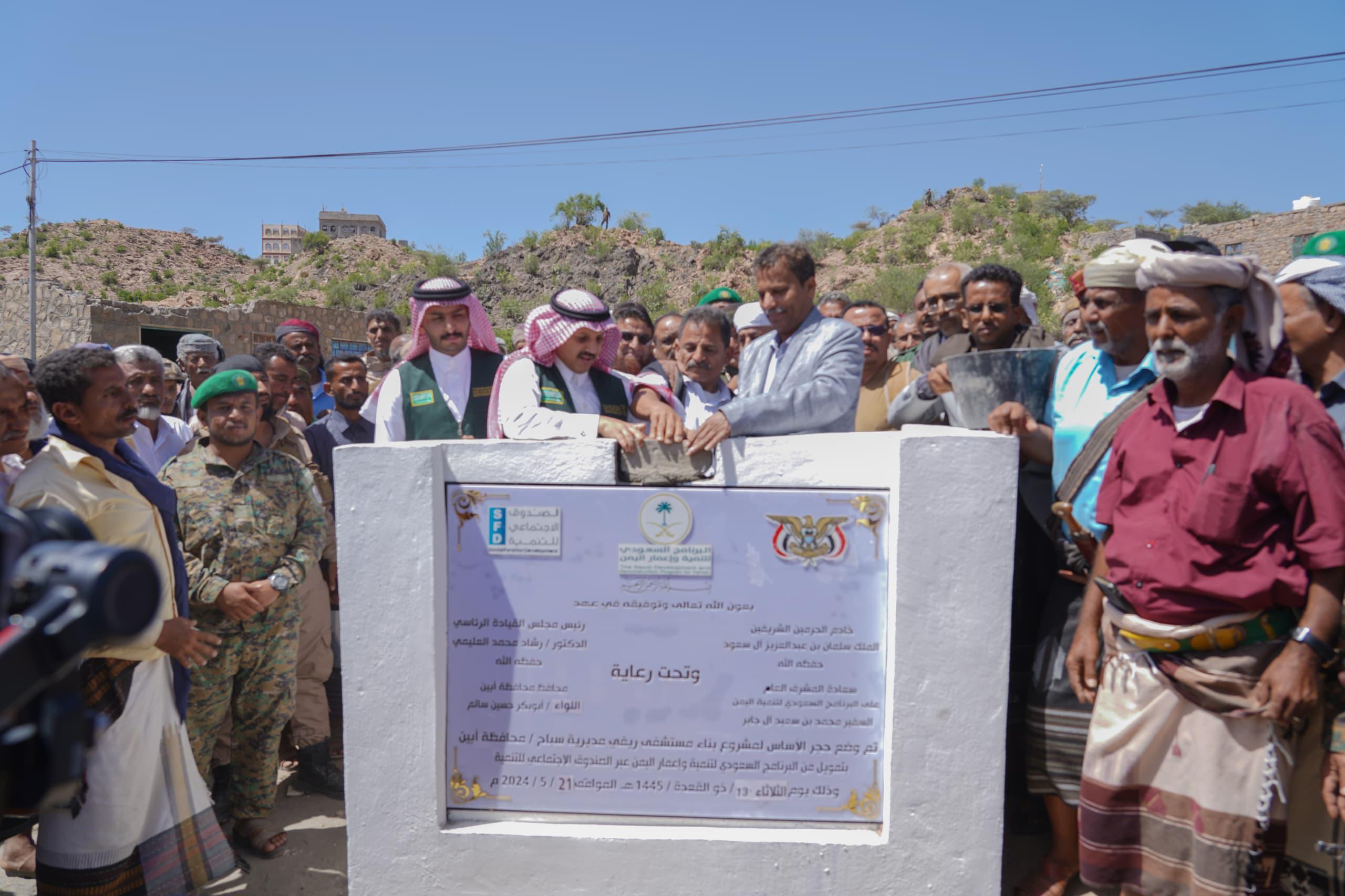 وضع محافظ محافظة أبين اللواء الركن أبوبكر حسين سالم، اليوم، بمعية المهندس أحمد المدخلي مدير البرنامج السعودي لتنمية وإعمار اليمن بالعاصمة عدن، حجر الأساس لمشروع بناء مستشفى سباح الريفي بمديرية سباح، عبر الصندوق الاجتماعي للتنمية.