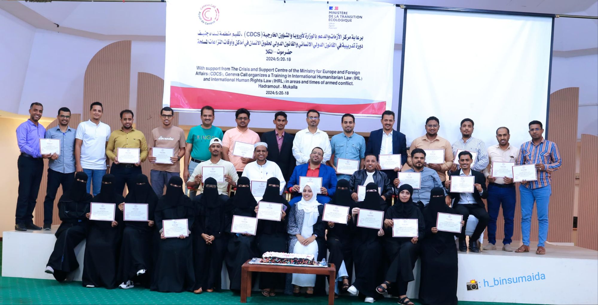 اختتمت منظمة نداء جنيف الدورة التدريبية في القانون الدولي الإنساني والقانون الدولي لحقوق الإنسان في أماكن وأوقات النزاعات المسلحة وبرعاية مركز الأزمات والدعم بالوزارة لاوروباء والشؤون الخارجية (CDCS) بالمكلا .