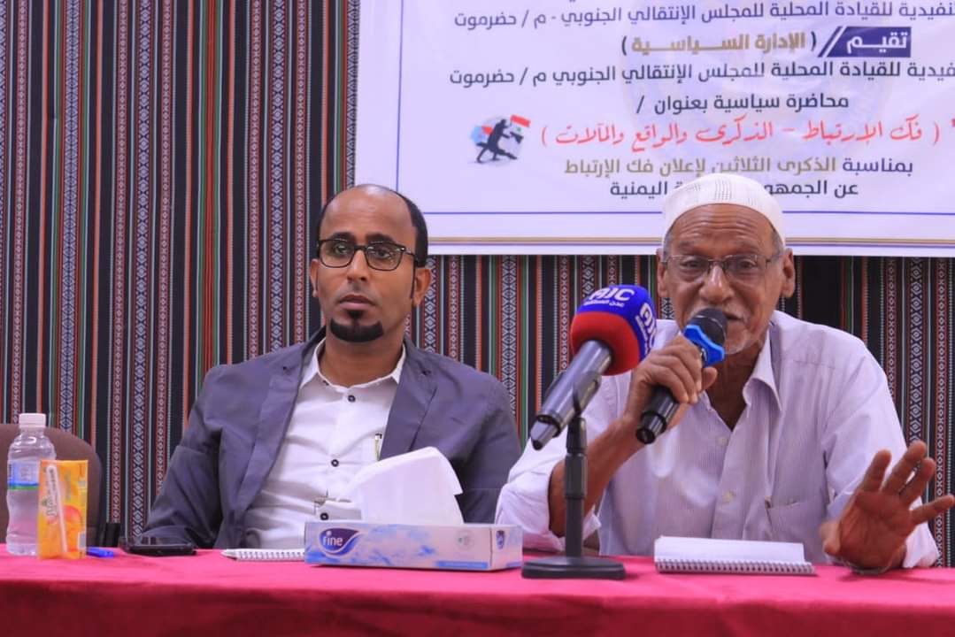 نظمت الإدارة السياسية بالهيئة التنفيذية للقيادة المحلية للمجلس الانتقالي الجنوبي بمحافظة حضرموت، اليوم الخميس، محاضرة سياسية بعنوان ”فك الارتباط الذكرى والواقع والمآلات“، بالتزامن مع الذكرى الـ (30) لإعلان فك الارتباط عن الجمهورية العربية اليمنية.