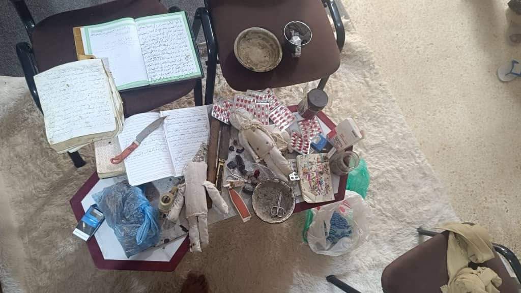 وعثرت القوة الأمنية بداخل البيت على لوح معدني خاص بإعادة تكرير مادة الحشيش المخدر وصحون عليها بواقي حشيش وعصا تستخدم في عجن الحشيش وكذا وصلة حشيش وادوات تعاطي مادة الشبو المخدر وعدد 8 أشرطة مخدرة ، وكما ضبط بحوزته دفاتر وكتابات شعوذة وعدد 2 دمية مصنوعة من القطن عليها مسامير تستخدم في الشعوذة حيث تم تحريز المضبوطات وايداع المتهم السجن لاستكمال الاجراءات القانونية.