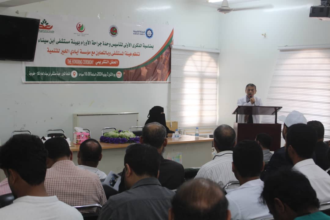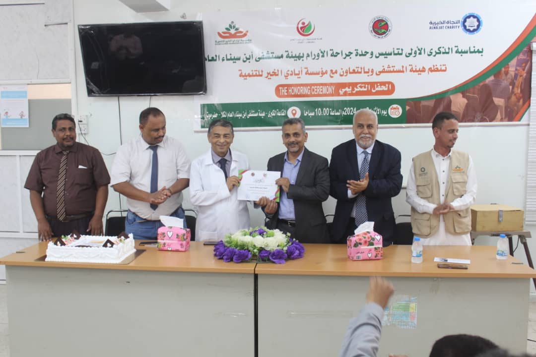 نظمت هيئة مستشفى أبن سينأ بالمكلا، بالتعاون مع مؤسسة أيادي الخير للتنمية ,اليوم ، احتفال تكريمي بمرور عام على تأسيس وحدة جراحة الأورام.