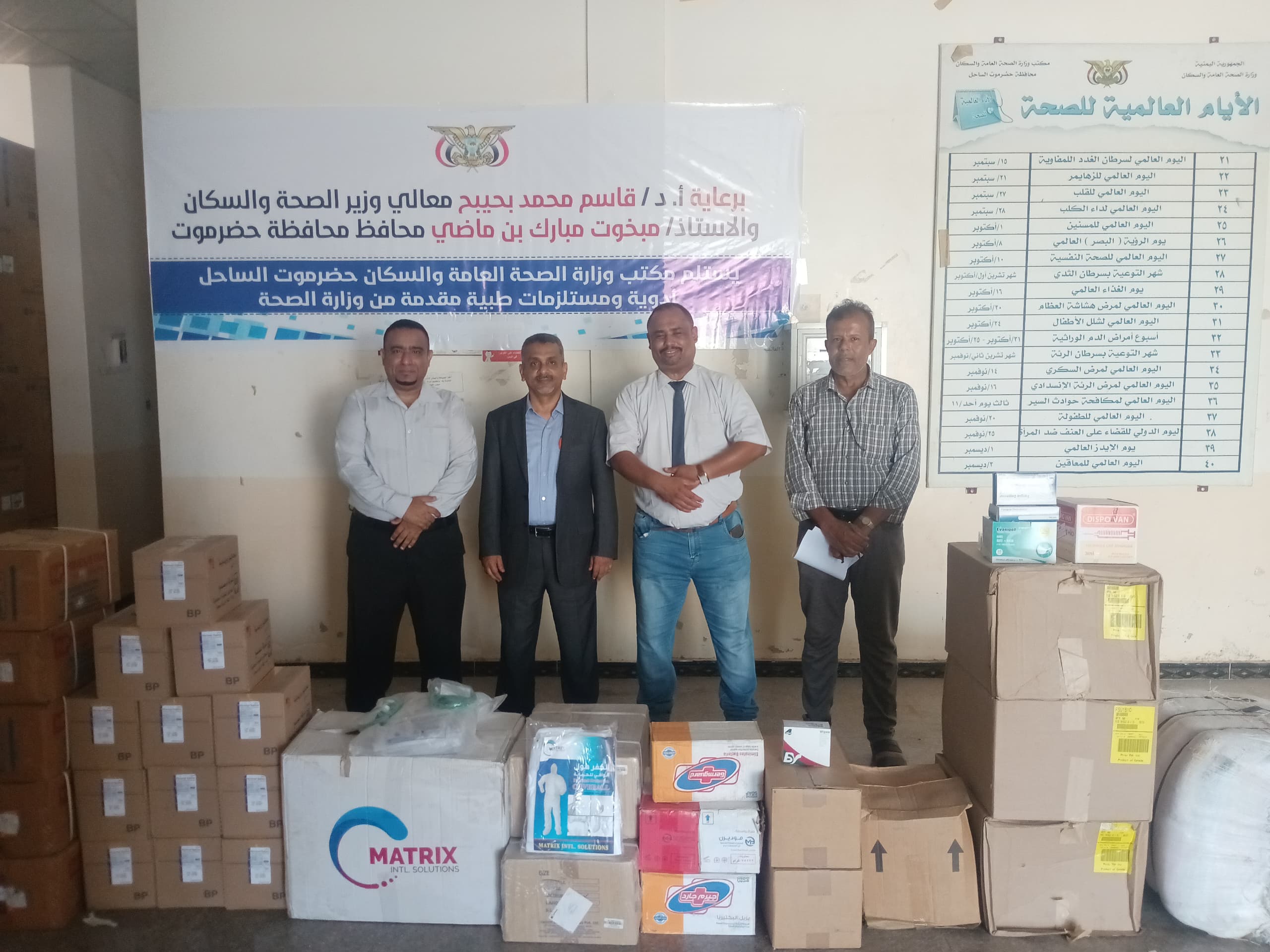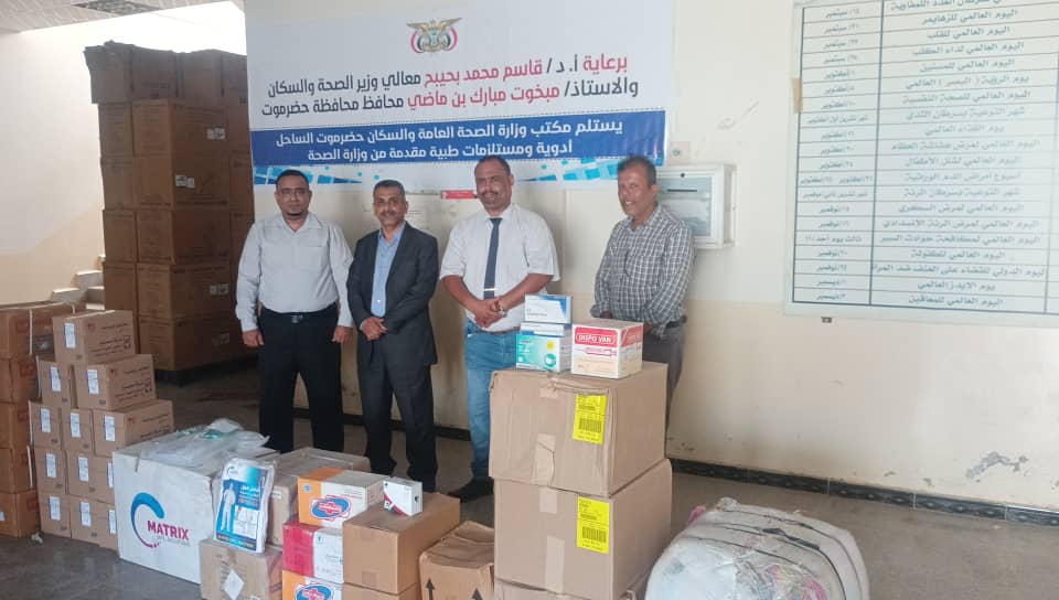 دشن كل من الدكتور أحمد سالم باصريح وكيل محافظة حضرموت للشئون الإدارية و المالية ، والدكتور محمد صالح الجمحي المدير العام لمكتب وزارة الصحة العامة والسكان بحضرموت الساحل ، استلام شحنة كميات من الأدوية و المستلزمات الطبية ، مقدمة من وزارة الصحة والسكان ، وذلك برعاية كريمة من معالي وزير الصحة العامة والسكان الأستاذ الدكتور قاسم محمد بحيبح و محافظ محافظة حضرموت الأستاذ مبخوت مبارك بن ماضي .