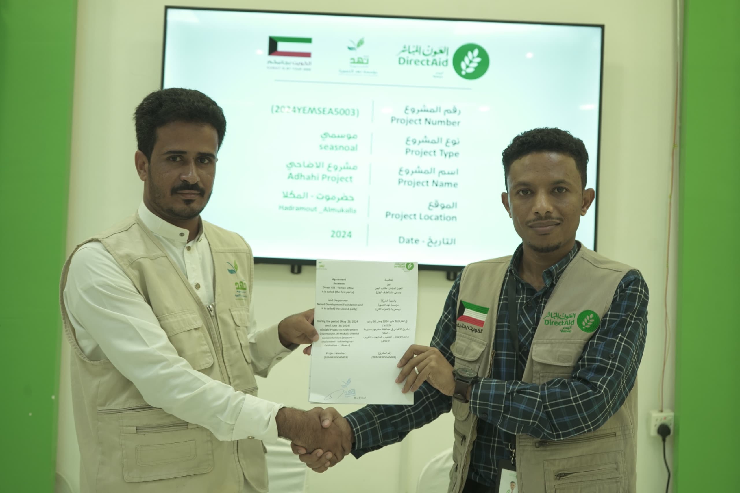وقع بمدينة المكلا، اتفاقية لتنفيذ مشروع توزيع الأضاحي في ساحل حضرموت بين العون المباشر الكويتية – مكتب اليمن كممول للمشروع وتنفيذ مؤسسة نهد التنموية.
