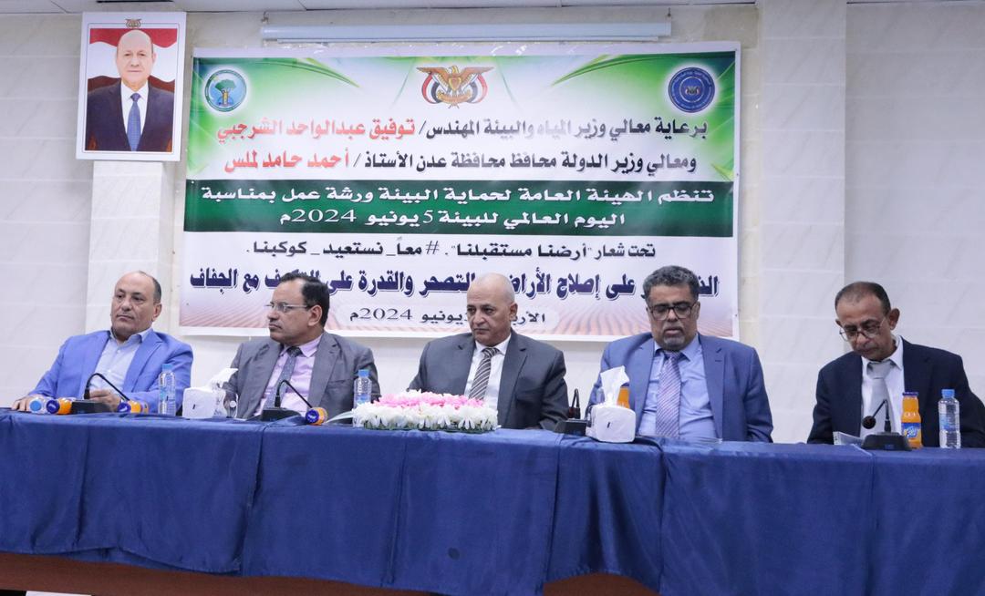 نظمت وزارة المياه والبيئة، والهيئة العامة لحماية البيئة، اليوم، في العاصمة المؤقتة عدن، ورشة عمل حول إصلاح الأراضي والتصحر والقدرة على التكيف مع عوامل الجفاف، وذلك بمناسبة اليوم العالمي للبيئة والذي يصادف 5 يونيو من كل عام ، تحت شعار (أرضنا مستقبلنا – معاً نستعيد كوكبنا).