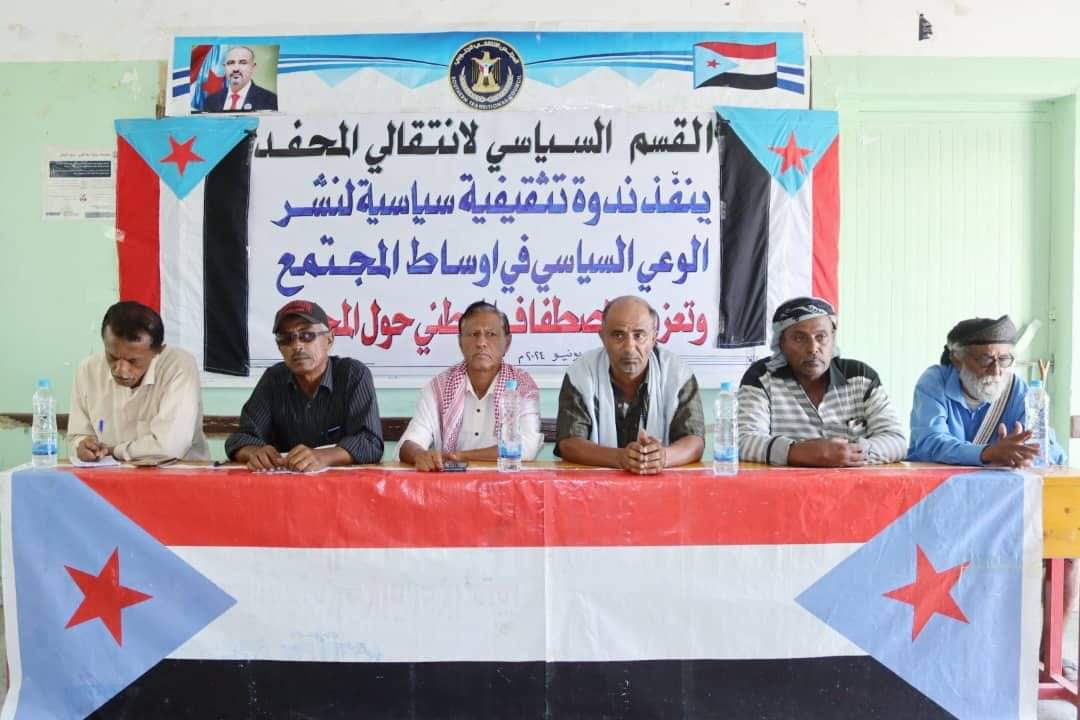 نظّم القسم السياسي بالهيئة التنفيذية للقيادة المحلية بالمجلس الانتقالي الجنوبي في مديرية المحفد بمحافظة أبين، اليوم الخميس، ندوة سياسية في تعزيز الاصطفاف الوطني حول المجلس الانتقالي، ونشر الوعي السياسي في أوساط المجتمع.