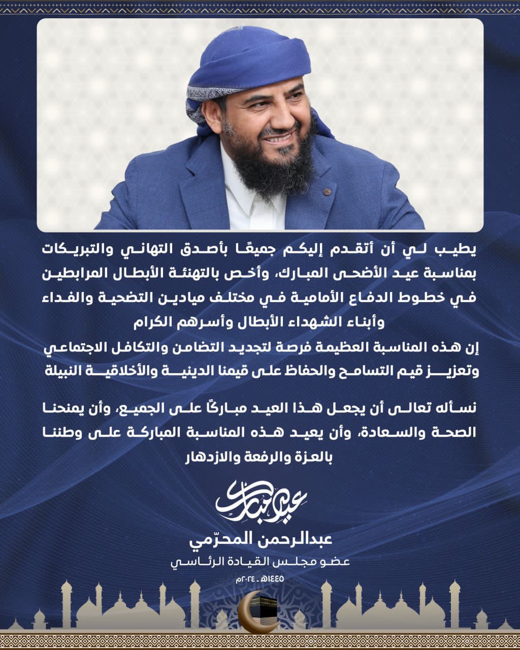 وقال يطيب لي أن أتقدم إليكم جميعًا بأصدق التهاني والتبريكات القلبية بمناسبة عيد الأضحى المبارك، وأخص بالتهنئة الأبطال المرابطين في خطوط الدفاع الأمامية في مختلف ميادين التضحية والفداء، وأبناء الشهداء الأبطال وأسرهم الكرام.