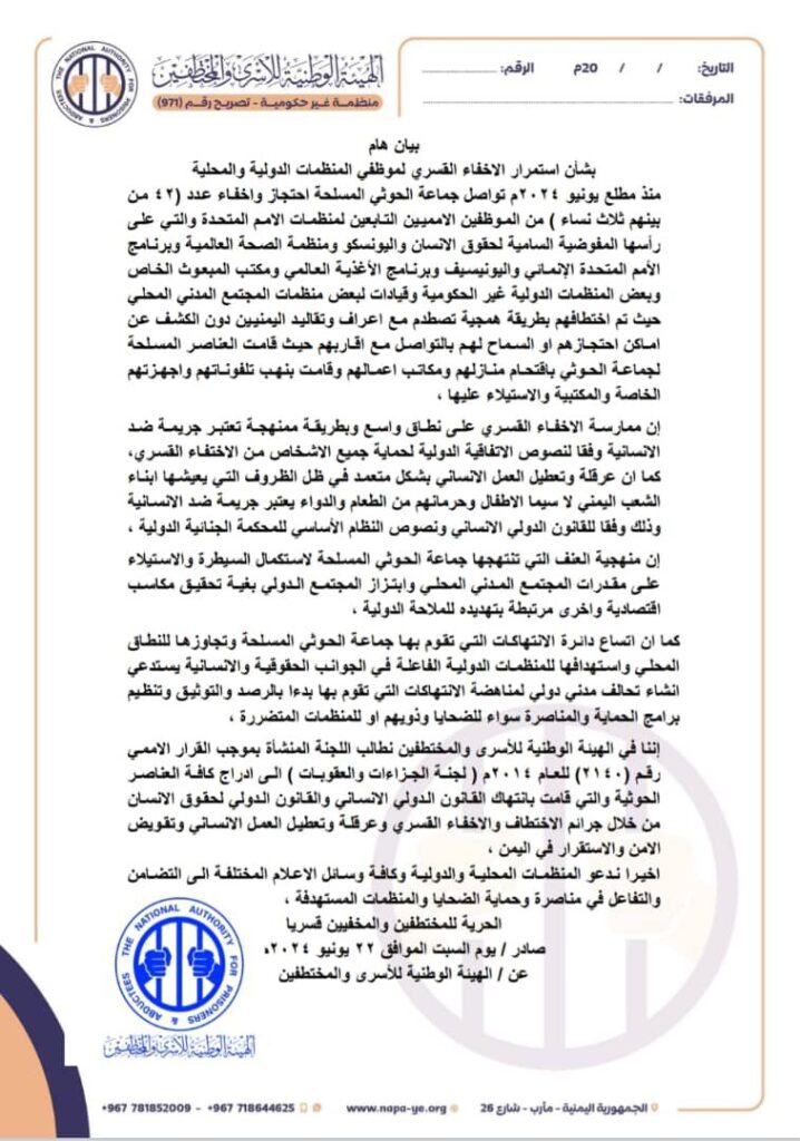 وأوضح البيان أن جماعة الحوثي المسلحة تحتجز وتخفي منذ مطلع يونيو 2024، 42 موظفاً بينهم ثلاث نساء، من العاملين لدى منظمات الأمم المتحدة، وفي مقدمتها المفوضية السامية لحقوق الإنسان، واليونسكو، ومنظمة الصحة العالمية، وبرنامج الأمم المتحدة الإنمائي، واليونيسيف، وبرنامج الأغذية العالمي، ومكتب المبعوث الخاص، إضافة إلى بعض المنظمات الدولية غير الحكومية وقيادات بعض منظمات المجتمع المدني المحلي.