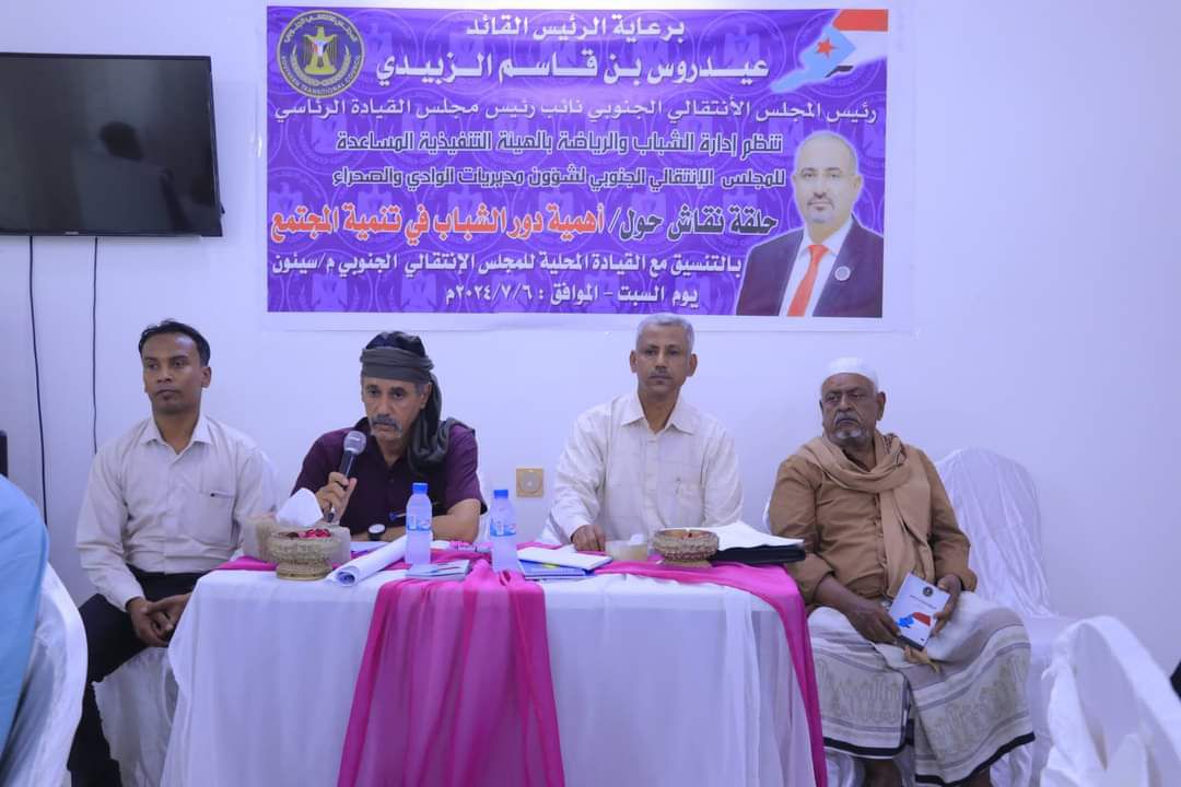 نظمت إدارة الشباب والرياضة بالهيئة التنفيذية المساعدة للمجلس الانتقالي الجنوبي لشؤون مديريات وادي وصحراء حضرموت، اليوم السبت، حلقة نقاشية بعنوان” دور الشباب في تنمية المجتمع”، برعاية الرئيس القائد عيدروس قاسم الزُبيدي رئيس المجلس الانتقالي الجنوبي.