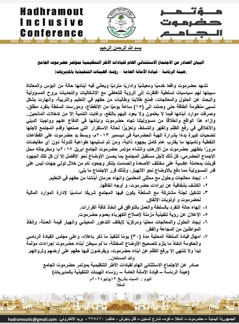 صادر عن الاجتماع الاستثنائي الهام لقيادات الأطر التنظيمية بمؤتمر حضرموت الجامع (هيئة الرئاسة – قيادة الأمانة العامة – رؤساء الهيئات التنفيذية بالمديريات)