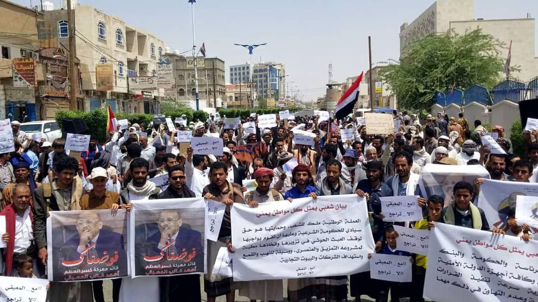 وأكد المتظاهرون في بيان تلقت وكالة الأنباء اليمنية سبأ نسخة منه: أن العملة الوطنية هي ملك للشعب، وحمايتها حق سيادي للحكومة الشرعية وعليها أن تقوم بواجبها لوقف العبث الحوثي في تزويرها واتخاذها وسيلة للنهب والقمع واستهداف الشركات والبيوت التجارية.
