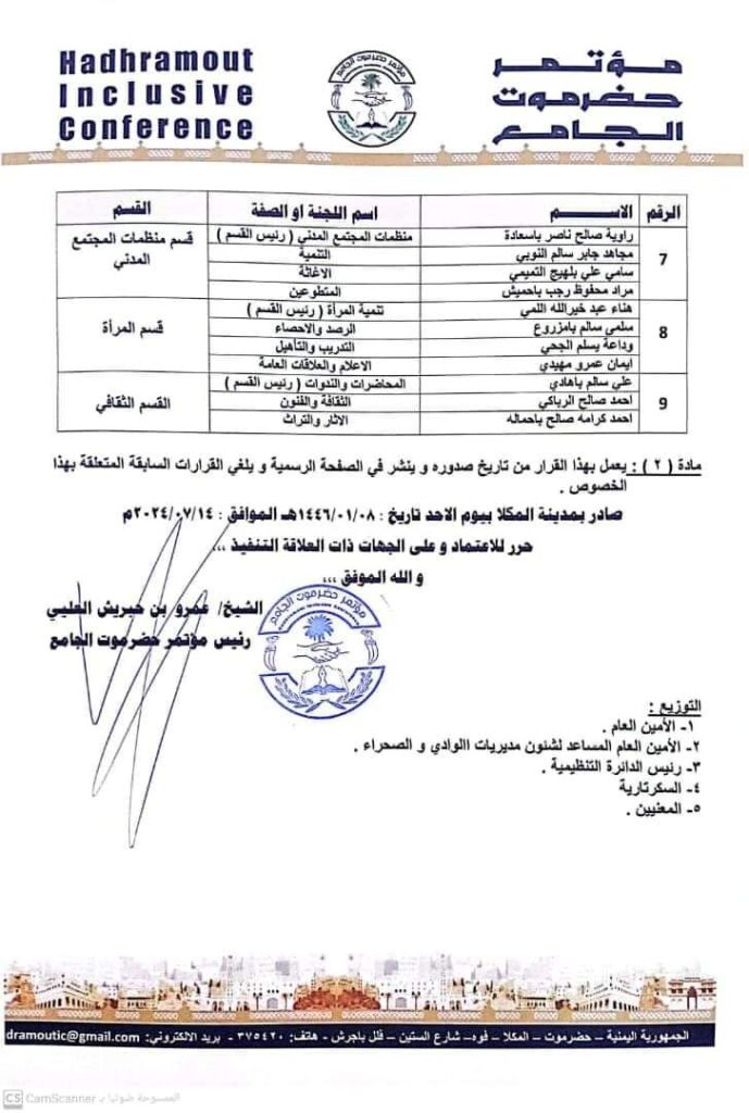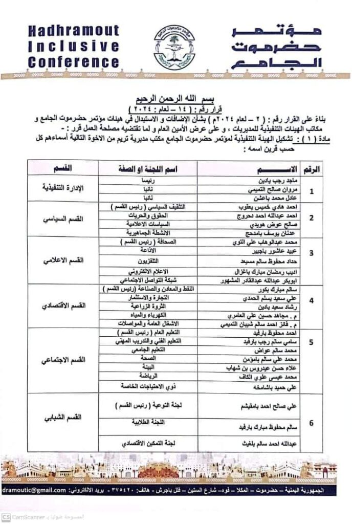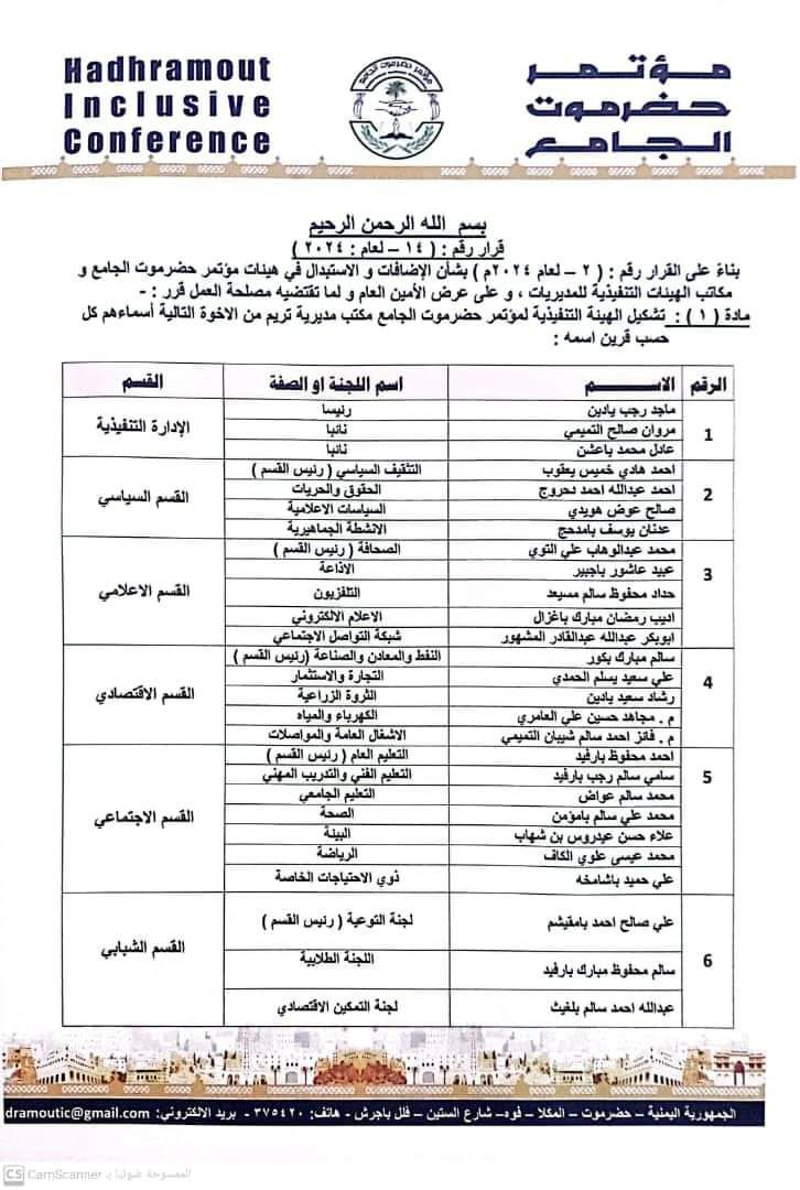 أصدر رئيس مؤتمر حضرموت الجامع الشيخ عمرو بن حبريش العليي، اليوم الأحد ، القرار رقم (14) لعام 2024م، و قضى في مادته الأولى بتشكيل الهيئة التنفيذية لمؤتمر حضرموت الجامع – مكتب مديرية تريم ، و تضم الإدارة التنفيذية، من الأخوة التالية أسماؤهم :