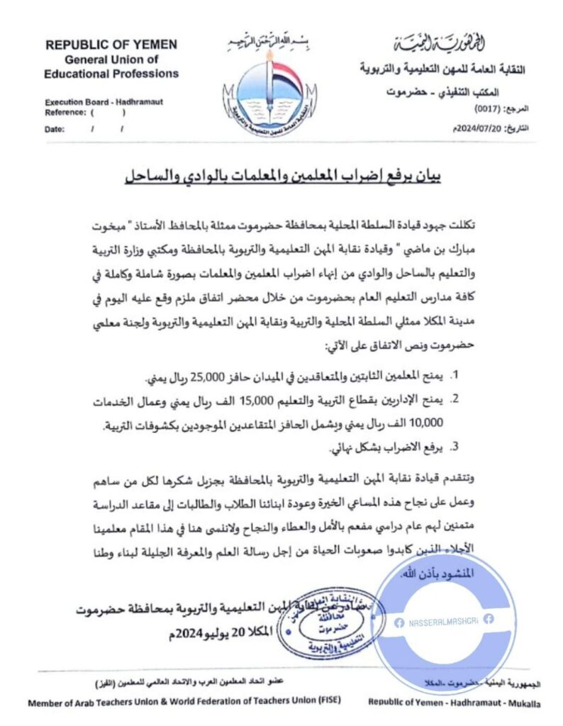 بإنهاء اضراب المعلمين والمعلمات بالوادي والساحل بصورة شاملة وكاملة في جميع مدارس التعليم العام بحضرموت وفق اتفاق ملزم لجميع الاطراف يهدف الى استمرار العملية التعليمية والحرص على التزام ابنائنا الطلاب في مقاعد الدرس.