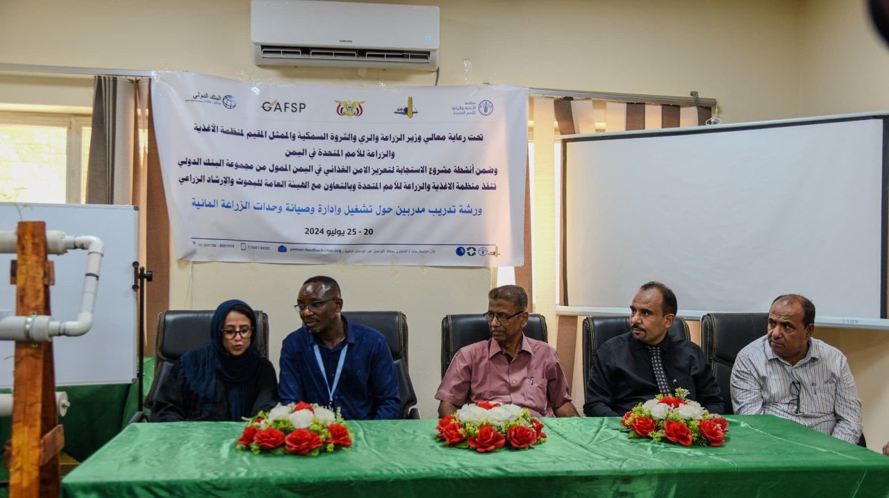 أختتمت الهيئة العامة للبحوث والإرشاد الزراعي بالعاصمة المؤقتة عدن، اليوم، فعاليات الورشة التدريبية والتأهيلية الخاصة بتدريب مدربين لتشغيل وإدارة وصيانة وحدات الزراعة المائية، التي نظمتها الهيئة بالتعاون مع منظمة الأغذية والزراعة للأمم المتحدة، ضمن أنشطة مشروع الإستجابة لتعزيز الأمن الغذائي في اليمن الممول من مجموعة البنك الدولي.