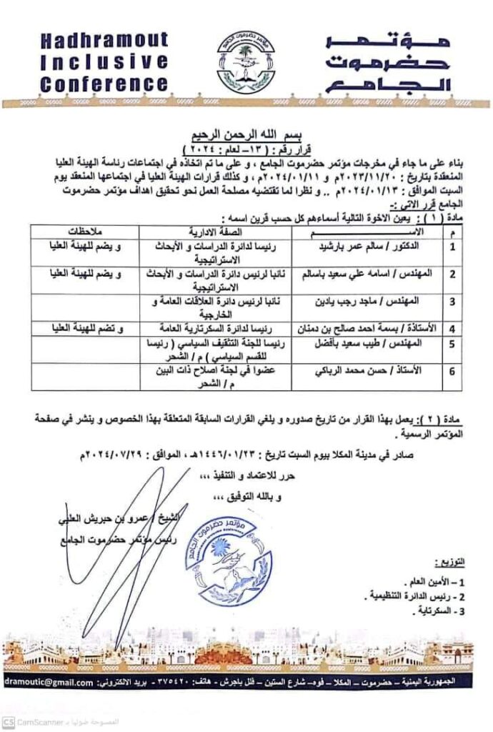 أصدر رئيس مؤتمر حضرموت الجامع الشيخ عمرو بن حبريش العليي، اليوم ، القرار رقم (13) لعام 2024م، قضت مادته الأولى بتعين الاخوة التالية أسماءهم كلًا قرين اسمه :