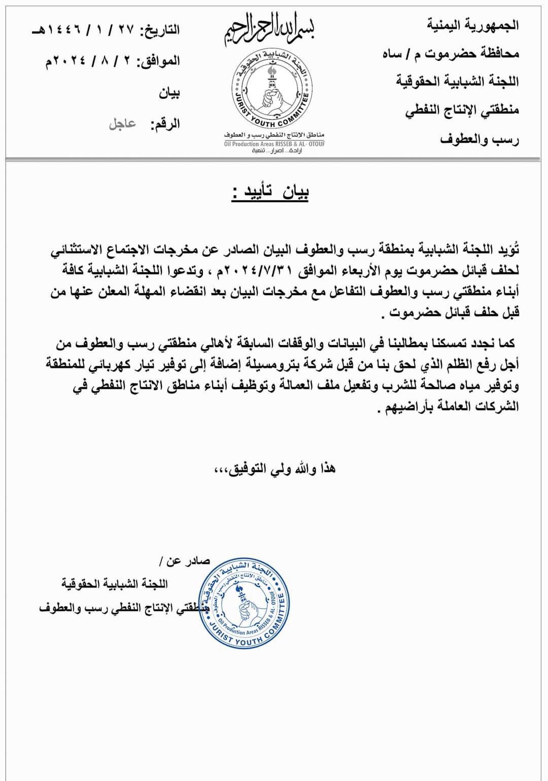تُؤيد اللجنة الشبابية بمنطقة رسب والعطوف البيان الصادر عن مخرجات الاجتماع الاستثنائي لحلف قبائل حضرموت يوم الأربعاء الموافق 31/7/2024م ، وتدعوا اللجنة الشبابية كافة أبناء منطقتي رسب والعطوف التفاعل مع مخرجات البيان بعد انقضاء المهلة المعلن عنها من قبل حلف قبائل حضرموت .