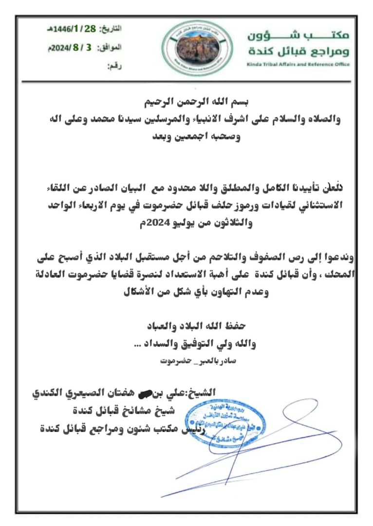 نعلن تأييدنا الكامل والمطبق واللا محدود مع البيان الصادر عن اللقاء الاستثنائي لقيادات ورموز حلف قبائل حضرموت في يوم الأربعاء الواحد والثلاثون من يوليو 2024م.