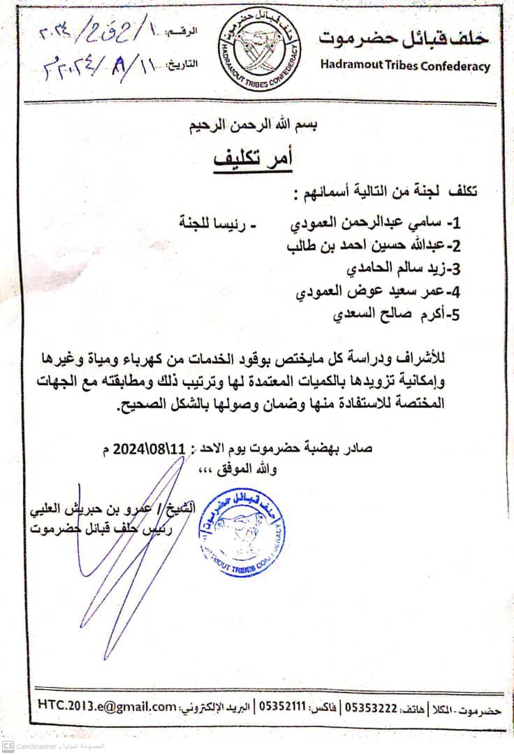أصدر رئيس حلف قبائل حضرموت، الشيخ عمرو بن حبريش العليي، اليوم، أمر تكليف بلجنة للإشراف ودراسة كل مايختص بوقود الخدمات من كهرباء ومياة وغيرهما، وإمكانية تزويدها بالكميات المعتمدة لها وترتيب ذلك ومطابقته مع الجهات المختصة للاستفادة منها وضمان وصولها بالشكل الصحيح.