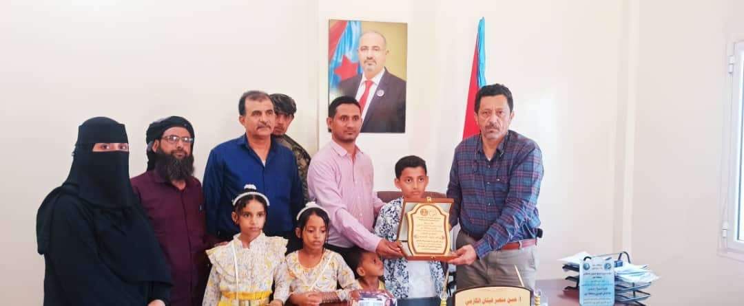 كرم رئيس الهيئة التنفيذية للقيادة المحلية للمجلس الانتقالي الجنوبي بمحافظة أبين الاستاذ حسن منصر غيثان، اليوم الإثنين، الطفل يسلم وليد السعيدي الكلدي لإحرازه المركز الثاني في مسابقة عباقرة العرب في الحساب الذهني. في المسابقة التي في جمهورية تونس الشقيقة.