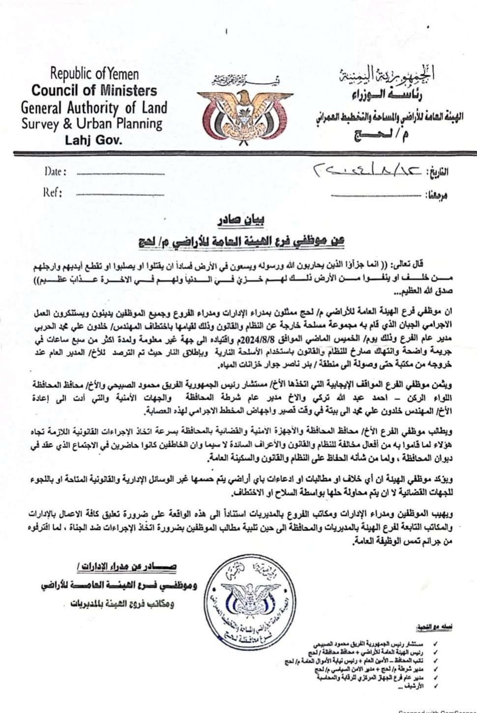 أدان موظفو فرع الهيئة العامة للأراضي في لحج اختطاف المهندس خلدون علي محمد الحربي، مدير عام الفرع، يوم الخميس الماضي، من قبل مجموعة مسلحة.