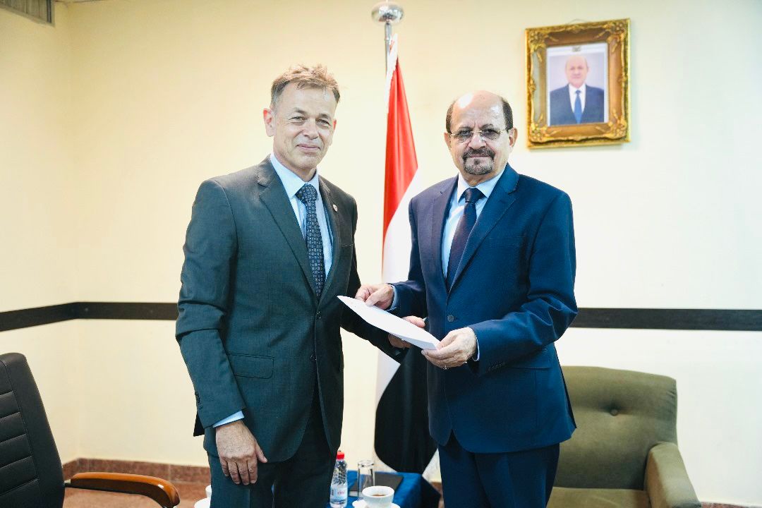 تسلم وزير الخارجية وشؤون المغتربين، الدكتور شايع الزنداني، اليوم، بالعاصمة المؤقتة عدن، أوراق اعتماد، يورج مونتاني، رئيساً لبعثة اللجنة الدولية للصليب الأحمر لدى اليمن.
