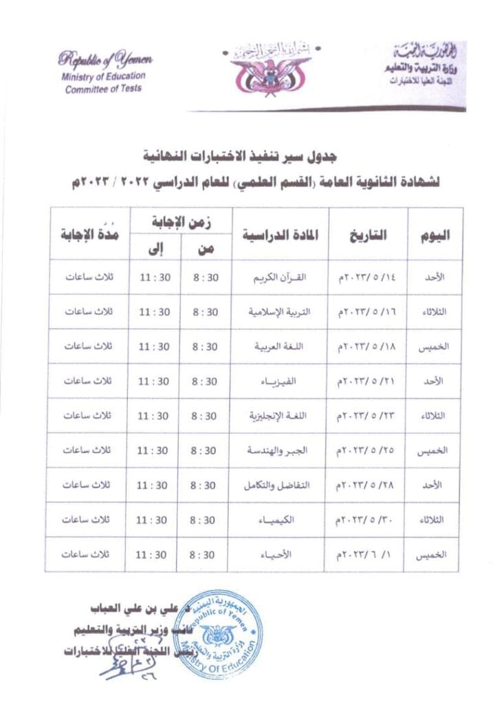 وزارة التربية والتعليم تنشر جدول اختبارات الثانوية العامة للعام الحالي 2022 -2023 للقسمين العلمي والأدبي
