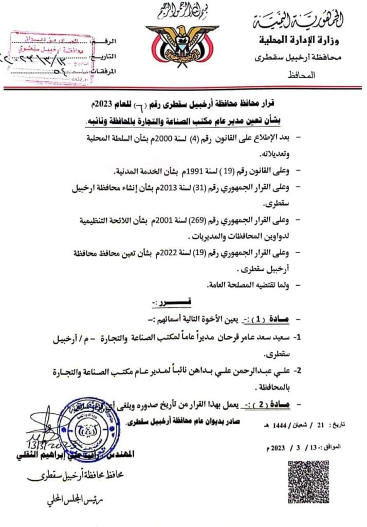 محافظ أرخبيل سقطرى يصدر قراراً بتعيين مديراً عاماً لمكتب الصناعة والتجارة بالمحافظة ونائبه