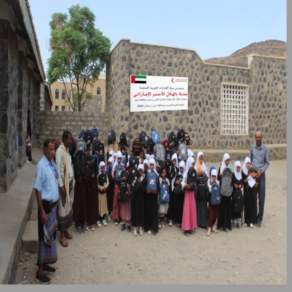 بدعم الهلال الأحمر الإماراتي.. توزيع حقائب مدرسية في مديرية جيشان أبين