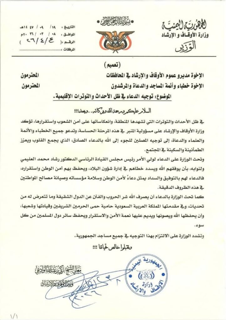 وزير الأوقاف يوجّه أئمة المساجد بإحياء سنة القنوت والدعاء لولي الأمر وللدول الشقيقة في ظل التوترات الإقليمي