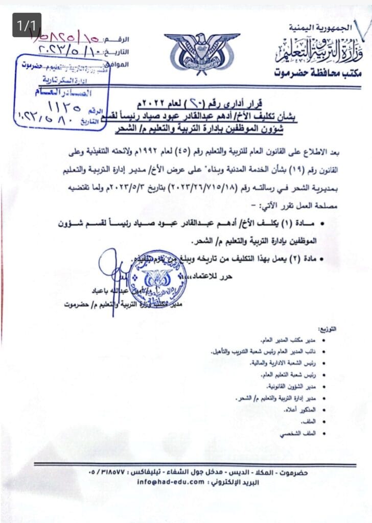 مدير عام تربية ساحل حضرموت يكلف رئيس قسم شؤون الموظفين بتربية الشحر
