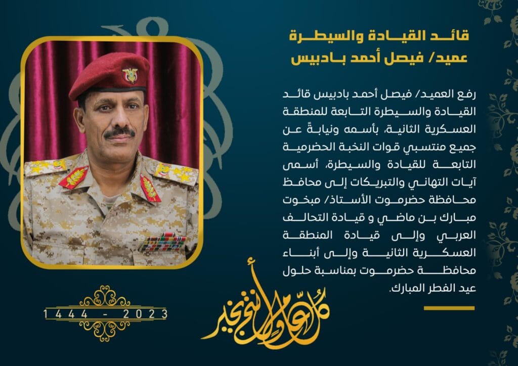 العميد بادبيس يهنئ محافظ محافظة حضرموت وقيادة التحالف العربي وقيادة المنطقة العسكرية الثانية بمناسبة حلول عيد الفطر المبارك