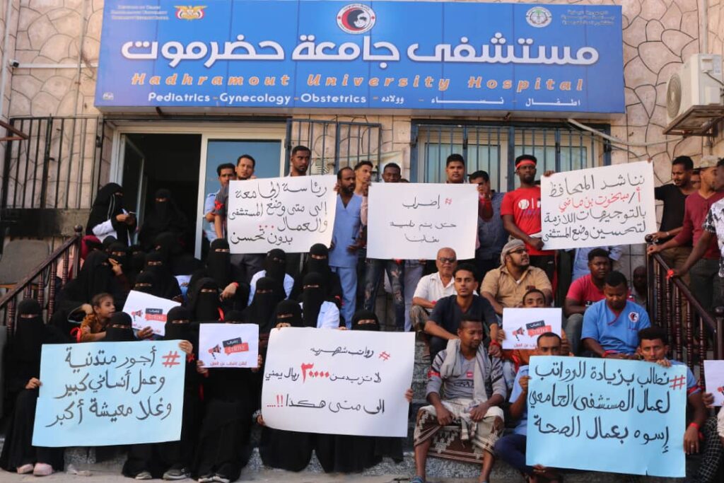 وقفة احتجاجية لعمال مستشفى جامعة حضرموت مطالبة بحقوق المتعاقدين قانونيا