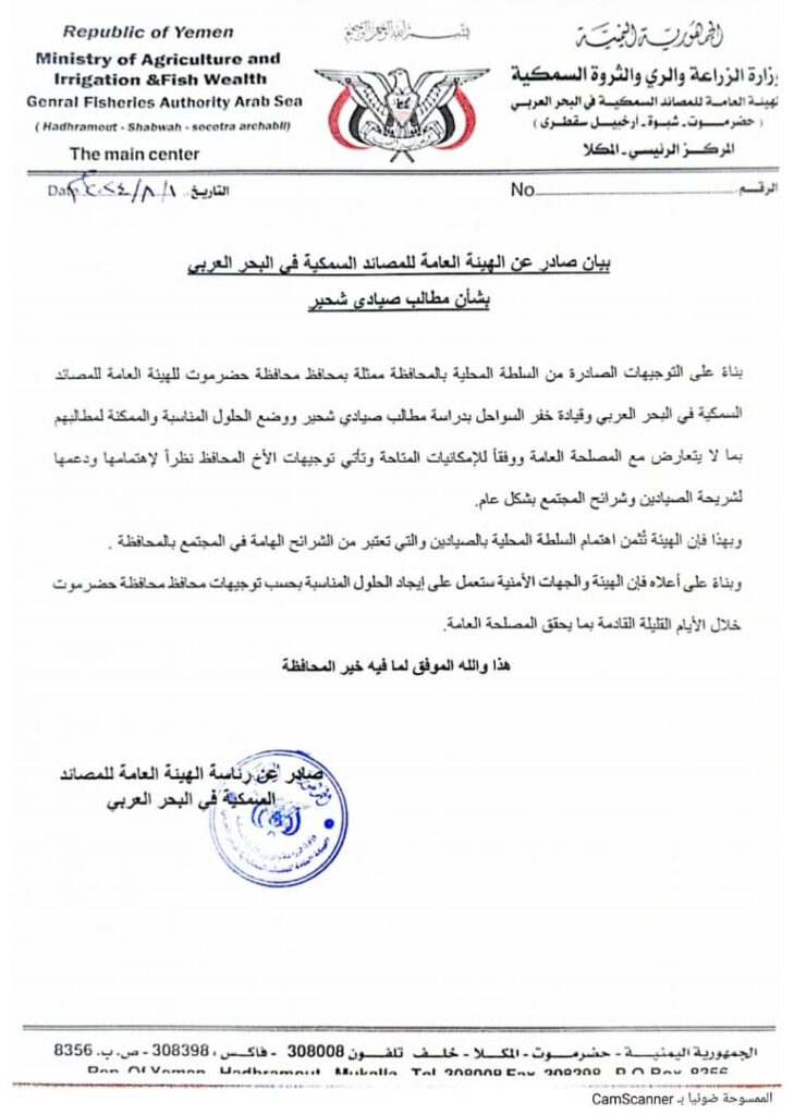 الهيئة العامة للمصائد السمكية في البحر العربي تصدر بيان هام بشأن مطالب صيادي شحير