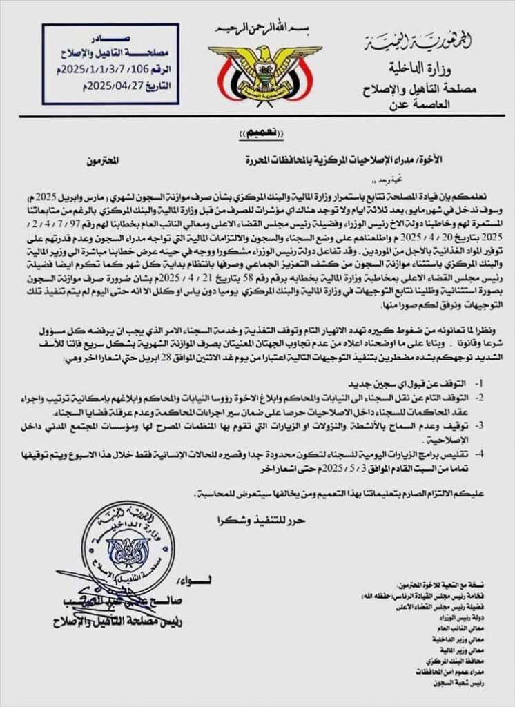 عاجل: مصلحة التأهيل والإصلاح بوزارة الداخلية تعلق نقل السجناء بالمحافظات المحررة(وثيقة)