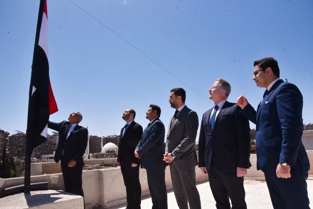 رفع العلم في سارية السفارة اليمنية في دمشق ايذانا بإعادة افتتاحها ومزاولة مهامها
