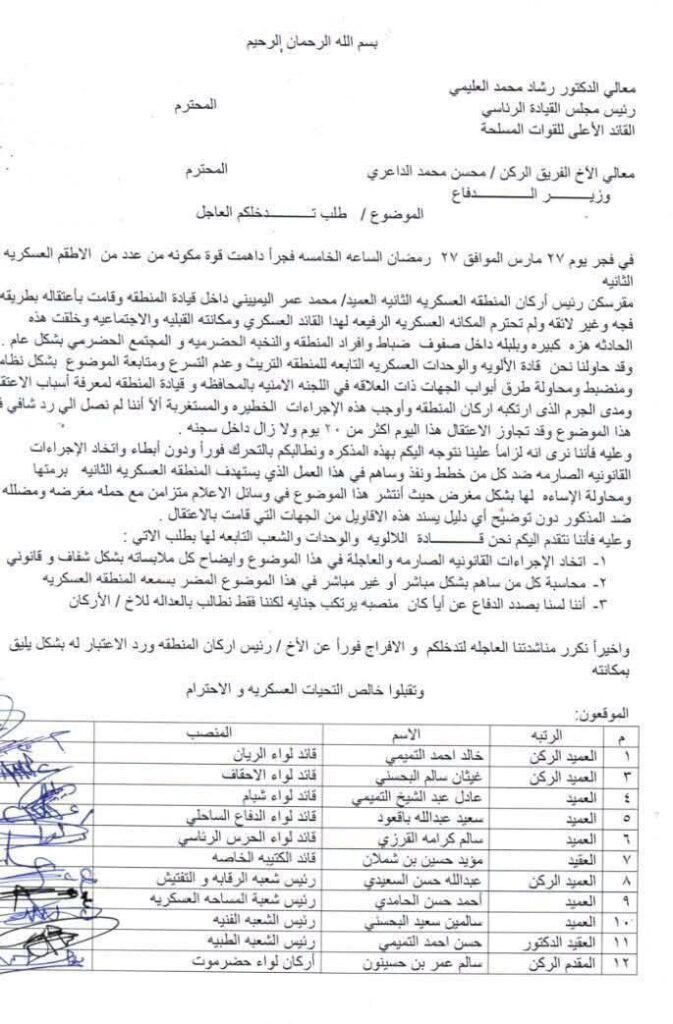 عاجل :قادة الألوية في المنطقة العسكرية الثانية يطالبون بتدخل عاجل للإفراج عن رئيس الأركان ومحاسبة المتسببين باعتقاله