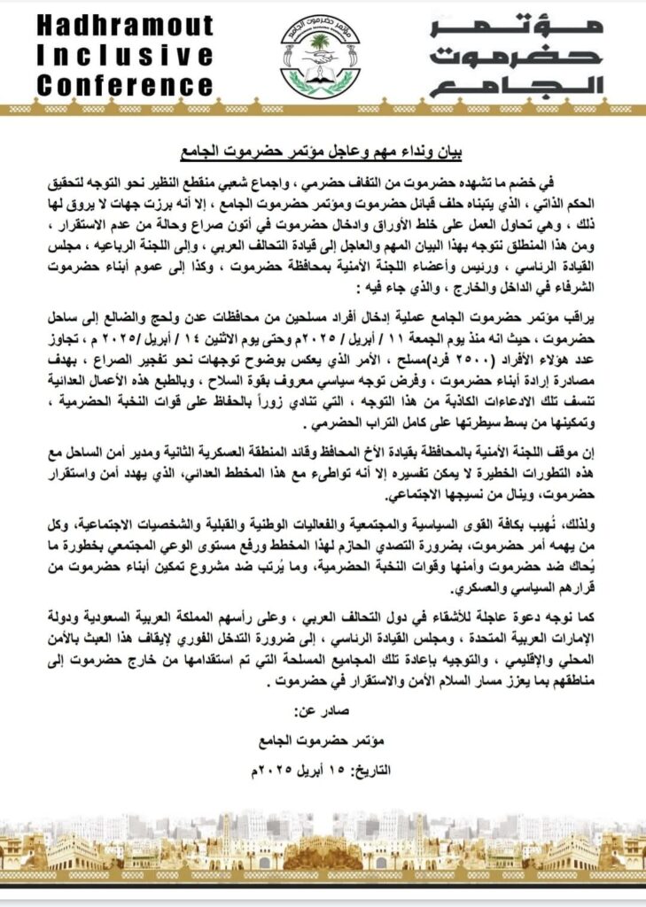 عاجل: مؤتمر حضرموت الجامع يوجه نداءً عاجلاً للتحالف العربي والقيادة اليمنية لوقف إدخال مجاميع مسلحة إلى ساحل حضرموت(بيان)