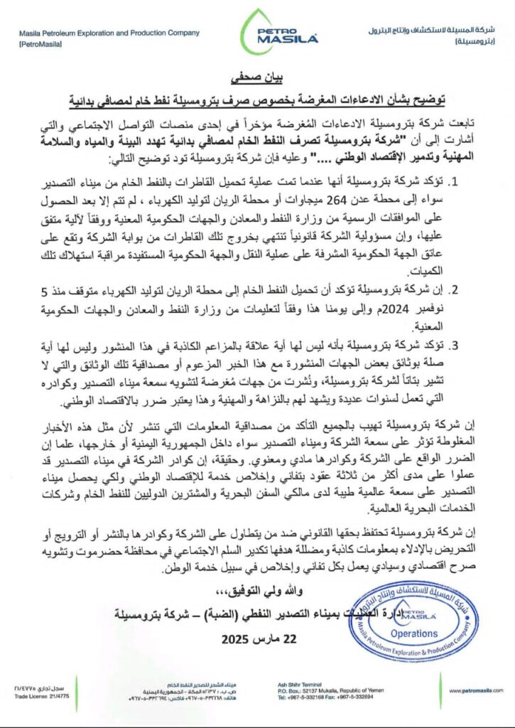شركة بترومسيلة تبدأ ضخ أول شحنة من وقود المازوت لمحطات توليد الكهرباء بساحل حضرموت